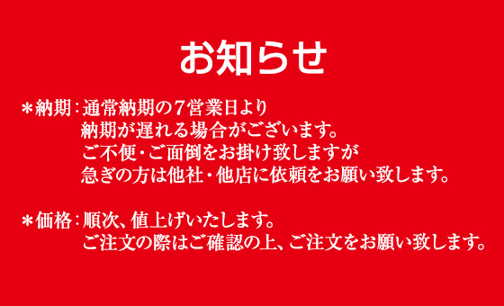 定休日について 臨時休業 :12月 3日(水)・17日(水) 冬期休業日:12月16日(火)から2026年1月5日(月) ※2026年1月6日(火)から通常営業となります ※12月16日から26日は15日(月)までに ご注文をいただいたお客様のみの対応となります。 年始の納品希望のご注文はお受けしておりますので 通常通りご注文をお願いいたします。 ※12月27日(土)から1月4日(日)は 完全休業のため納期計算に含まれません。