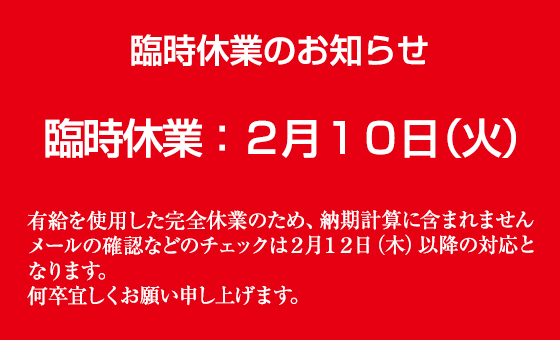 定休日について 臨時休業 :12月 3日(水)・17日(水) 冬期休業日:12月16日(火)から2026年1月5日(月) ※2026年1月6日(火)から通常営業となります ※12月16日から26日は15日(月)までに ご注文をいただいたお客様のみの対応となります。 年始の納品希望のご注文はお受けしておりますので 通常通りご注文をお願いいたします。 ※12月27日(土)から1月4日(日)は 完全休業のため納期計算に含まれません。
