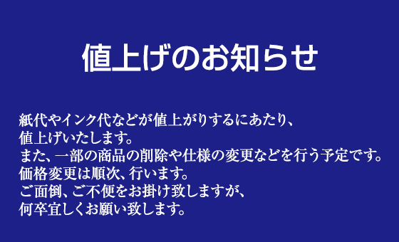 値上げいたします 10月1日から紙代など値上がりするにあたり、値上げいたします。 金額は順次、変更していきます。 ご面倒、ご不便をお掛けいたしますが、 ご注文の際はご確認の上、ご注文をお願いいたします。 ホームページの商品も含め、オフセット印刷や封筒・複写伝票など 全ての印刷物の価格が変更となります。 何卒宜しくお願い致します。 |